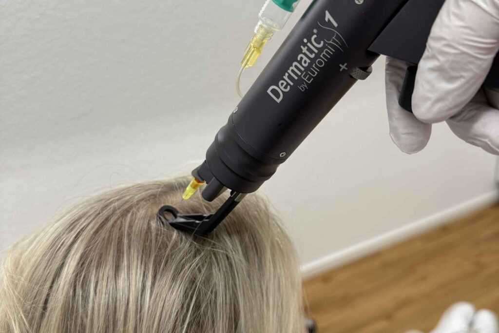 Bei der Haarausfallbehandlung in der Praxis Dr. Dauer werden Exosome, die aus pflanzlichen Quellen gewonnen werden, direkt in die Kopfhaut eingearbeitet.